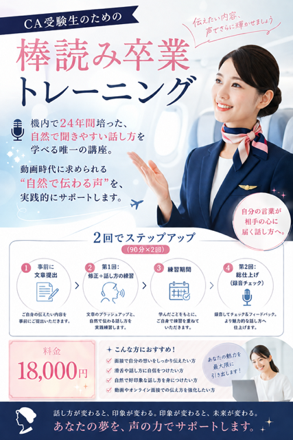 私はアナウンサーではありませんが、機内で24年間お客様に伝えるにはどうしたら良いだろうと格闘し続けました。接客業としてふさわしいあなただけの伝え方を、一緒に探していきましょう!
